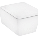 Wall-mounted rimless WC set in glossy ceramic with SoftClose urea seat, stainless steel hinges, and QuickRelease function for easy cleaning. Features AquaFall Flush for powerful rinsing, HygieneEffect glaze reducing bacterial growth, and NoiseReduction mat for quieter use. Back water connection, horizontal outlet, concealed fixation, 4.5L flush (EN997 Type 1 & 2 compliant), CE-conformed, DNSH-compliant (max. 6L/flush).