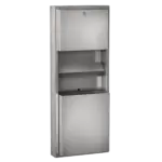 Waste bin, paper towel-, soap dispenser combination for wall mounting, stainless steel, surface satin finished, material thickness 0.8 mm, cylinder lock with KWC standard key, paper towel dispenser with loading capacity 300 – 400 pcs. of paper depending on convolution, suitable for liquid soaps and lotions, 0.8 liter soap tank, push lever, waste bin with approx. 23 liter capacity, includes stainless steel screws and dowels.